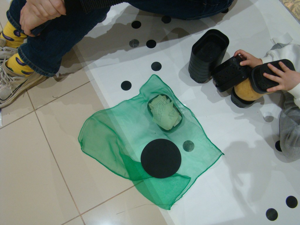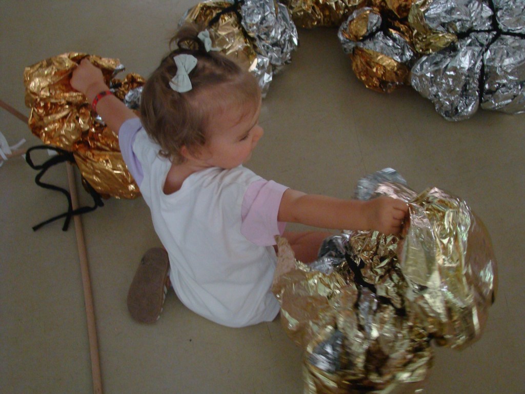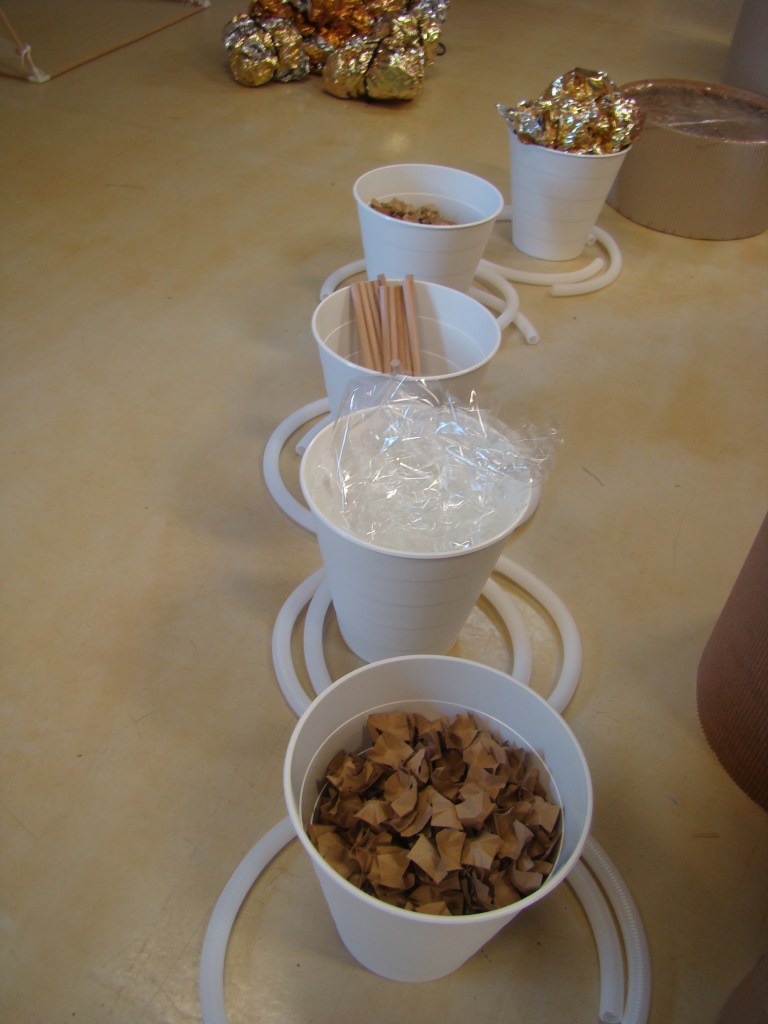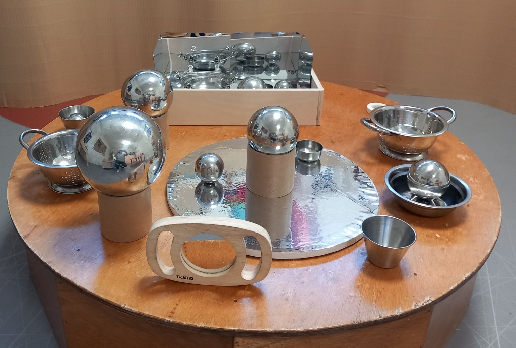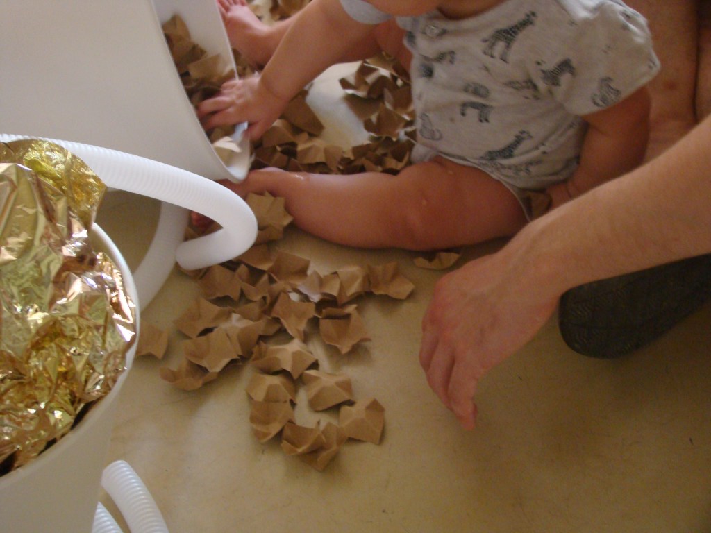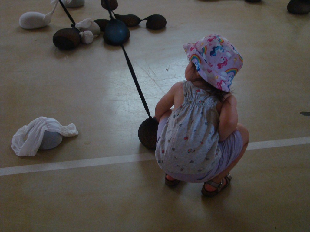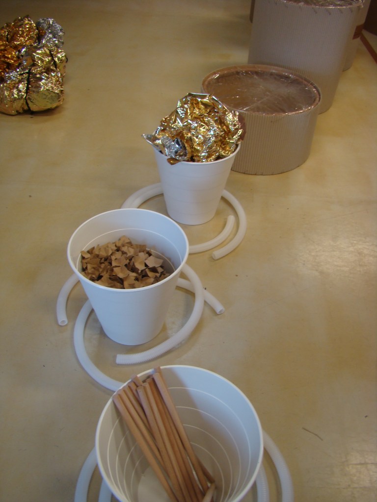 L’artiste SpY est une des sources d’inspiration qui a donné lieu à ce dispositif : utiliser des éléments de la vie de tous les jours (ou presque) pour produire du mouvement et des sons. S’isoler un peu pour mieux entendre, pour assembler et créer des effets sonores, ou juste écouter. Les objets comme les matières offrent des possibilités étonnantes ! On les livre ici à l’exploration des enfants. On peut s’autoriser à les découvrir, les faire vibrer, rouler, crisser… On peut aussi en faire tout autre chose.
