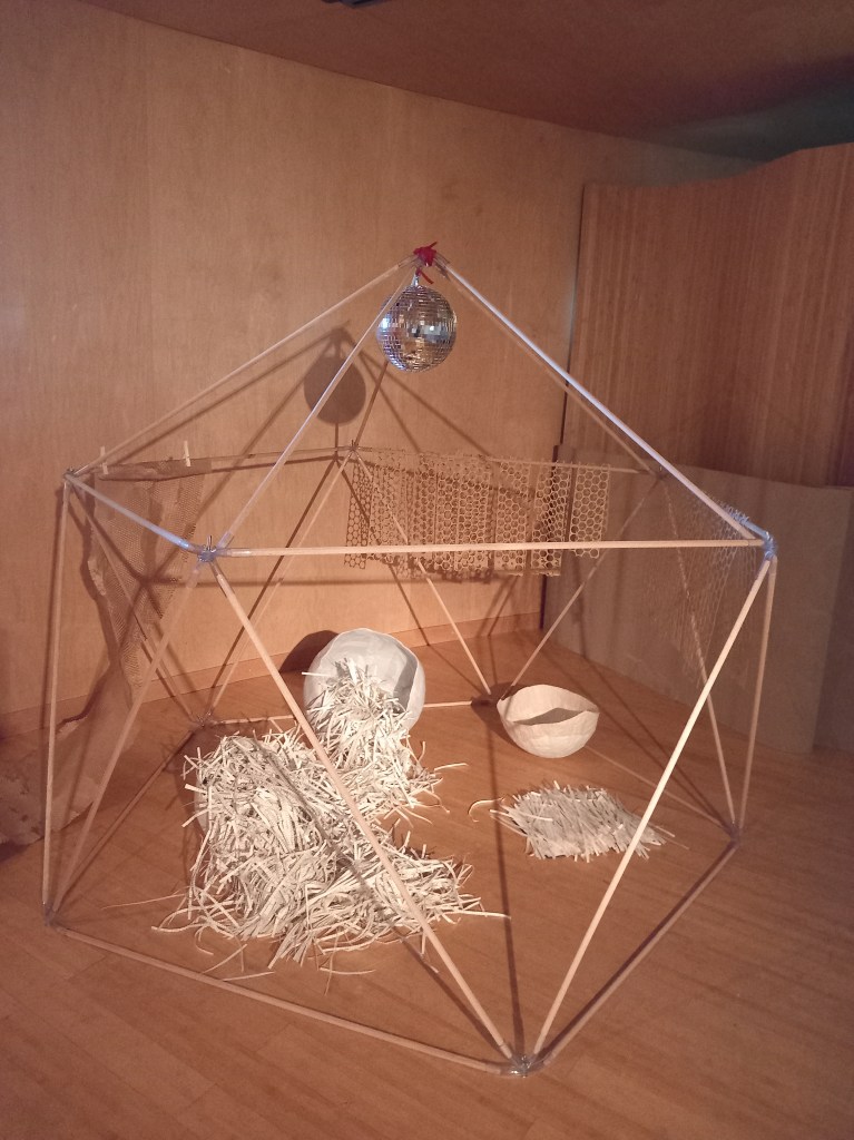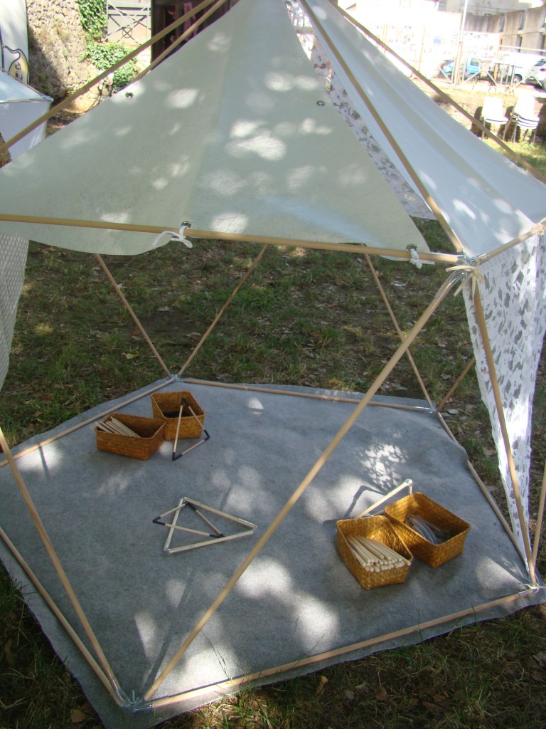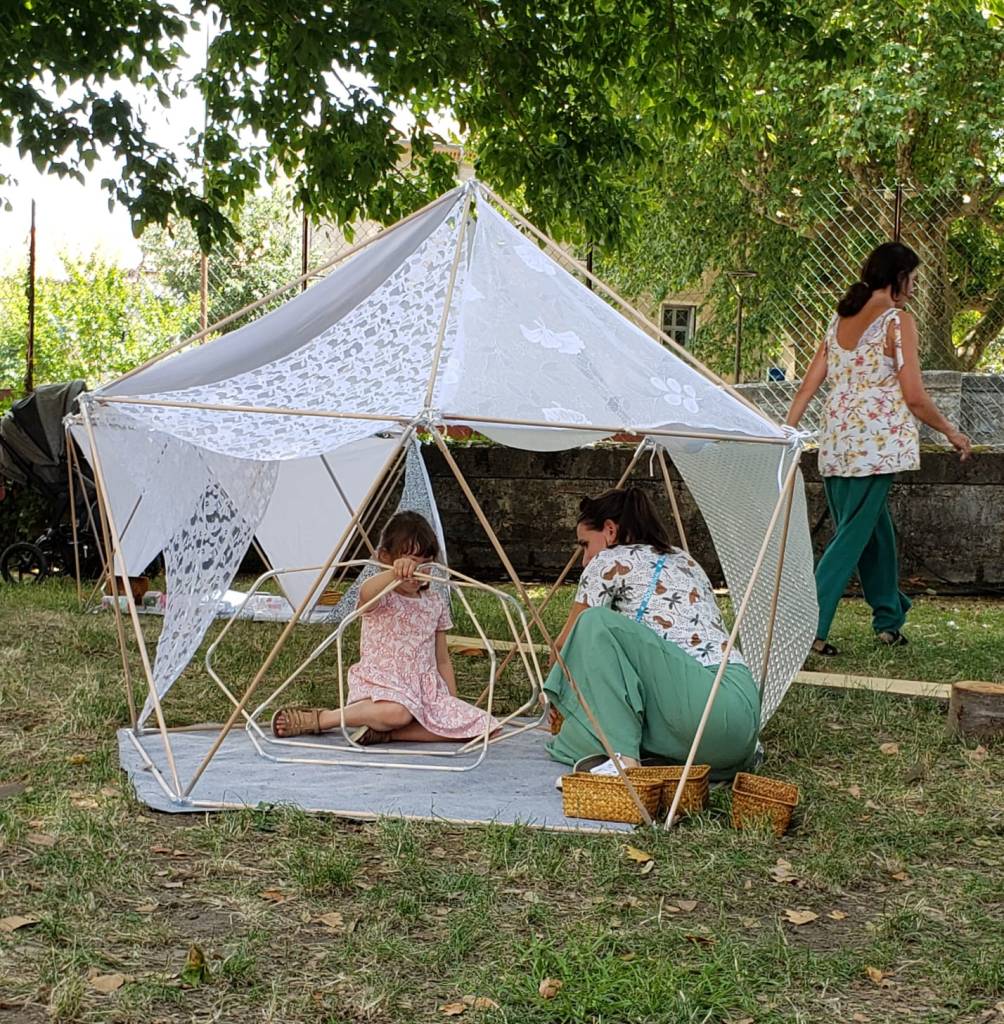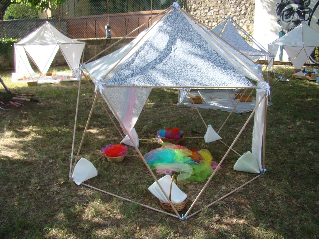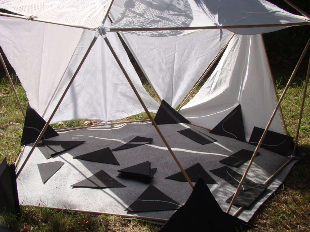Irene Fernandez, fondatrice de la démarche Createctura apprend à ses stagiaires à fabriquer ces dômes, et à scénographier les espaces dans lesquels ils séjournent. Il s’agit donc ici d’une histoire de transmission. Un dôme peut s’élever grâce à l‘agencement de dix triangles équilatéraux. A l’intérieur de chaque dôme inondé de lumière, des expériences trigonométriques et des accumulations poétiques. De triangles vêtus de noir émerge aussi une œuvre collective.