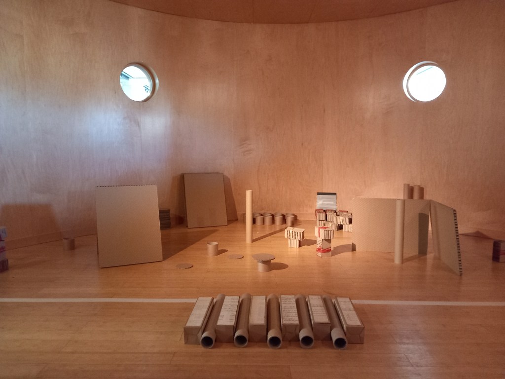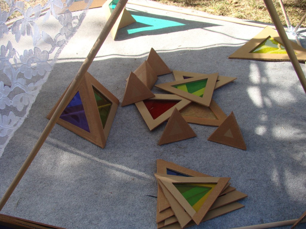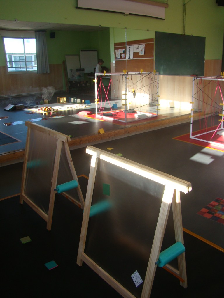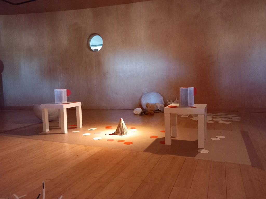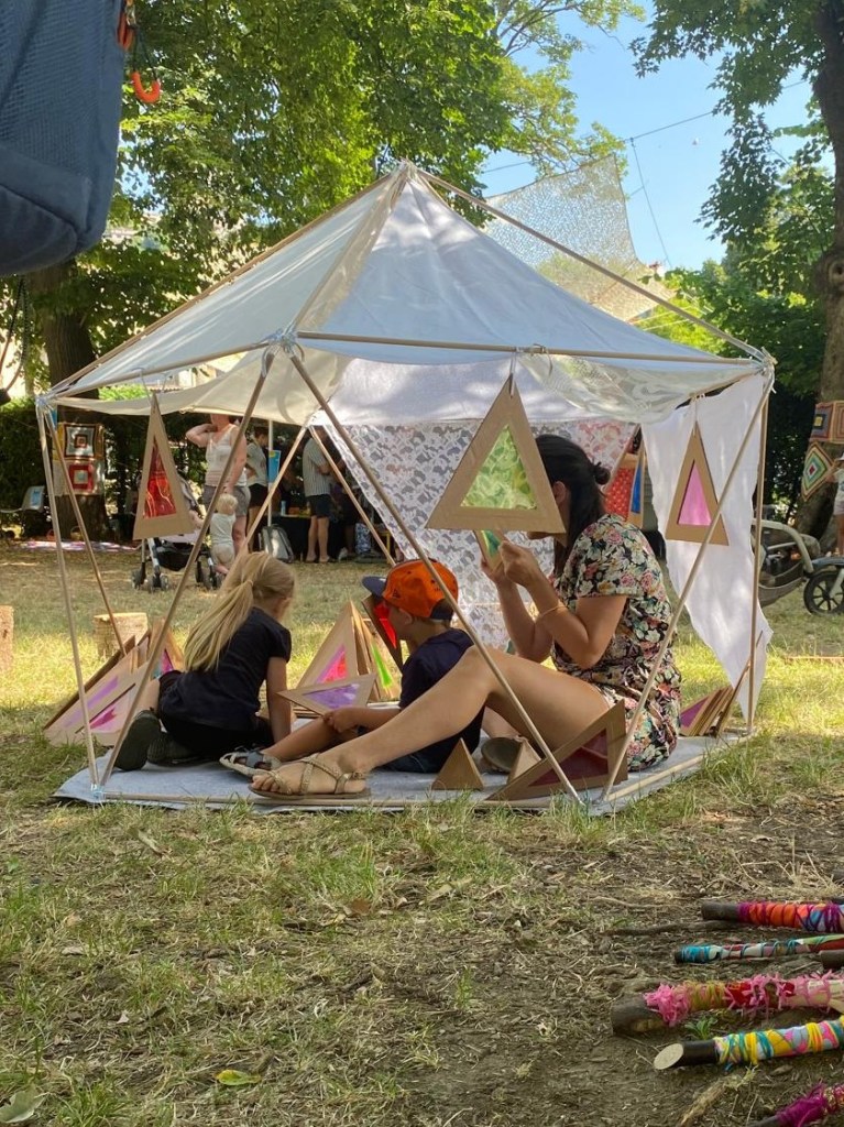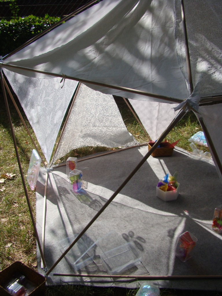 Irene Fernandez, fondatrice de la démarche Createctura apprend à ses stagiaires à fabriquer ces dômes, et à scénographier les espaces dans lesquels ils séjournent. Il s’agit donc ici d’une histoire de transmission. Un dôme peut s’élever grâce à l‘agencement de dix triangles équilatéraux. A l’intérieur de chaque dôme inondé de lumière, des expériences trigonométriques et des accumulations poétiques. De triangles vêtus de noir émerge aussi une œuvre collective.