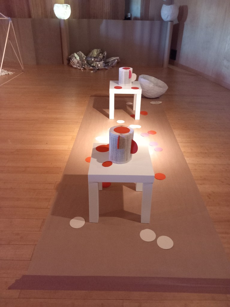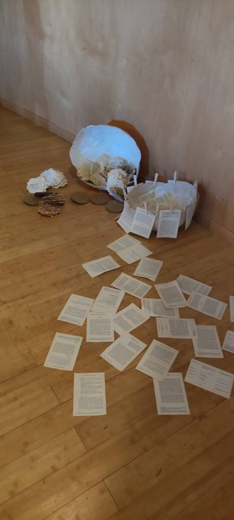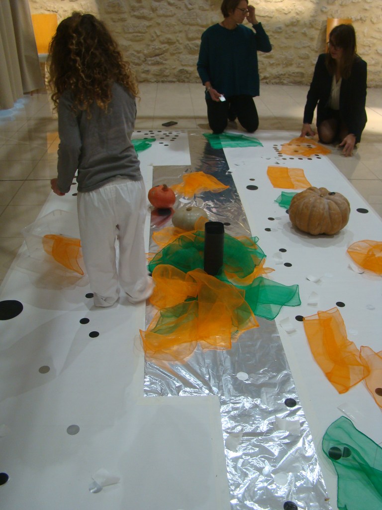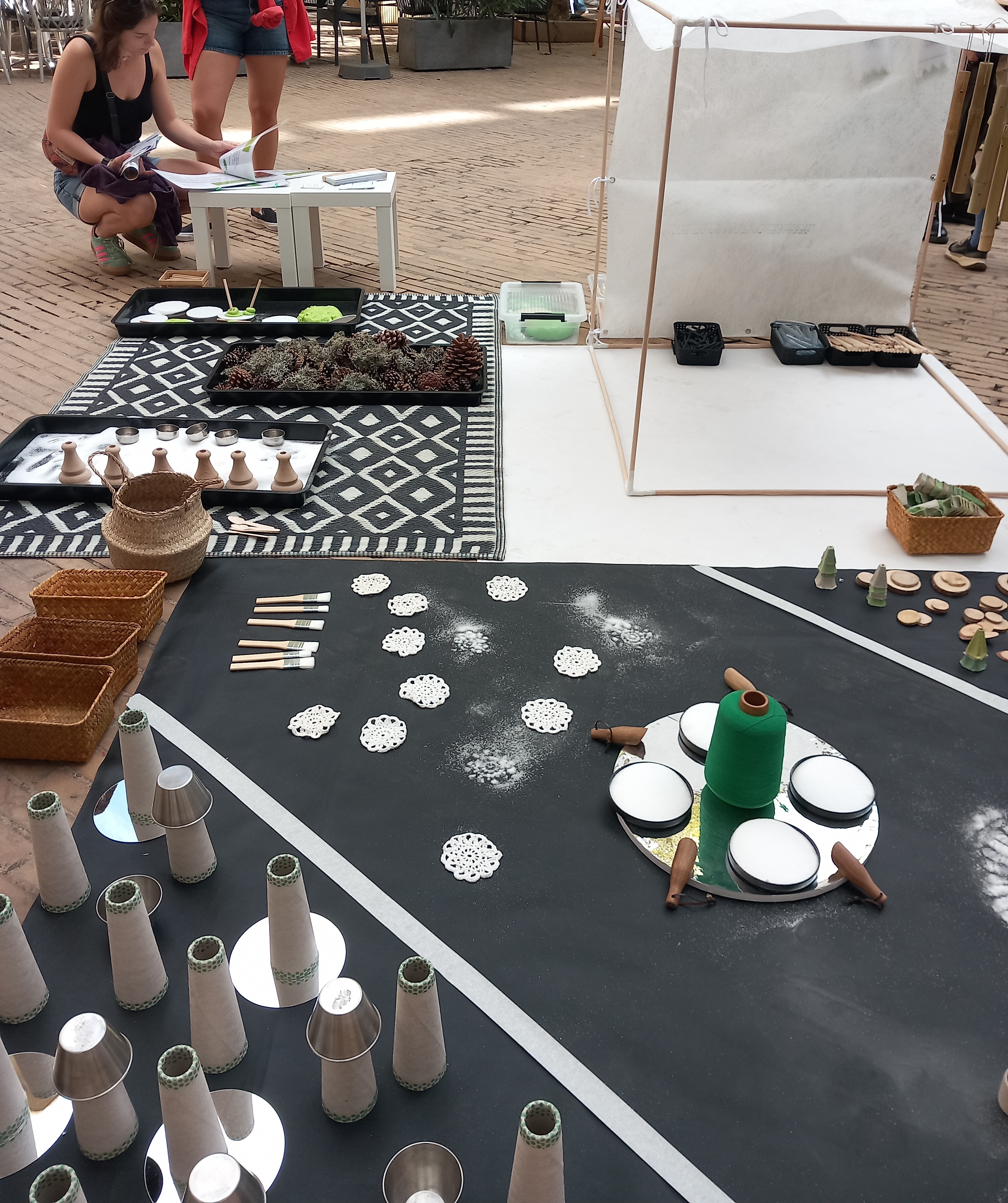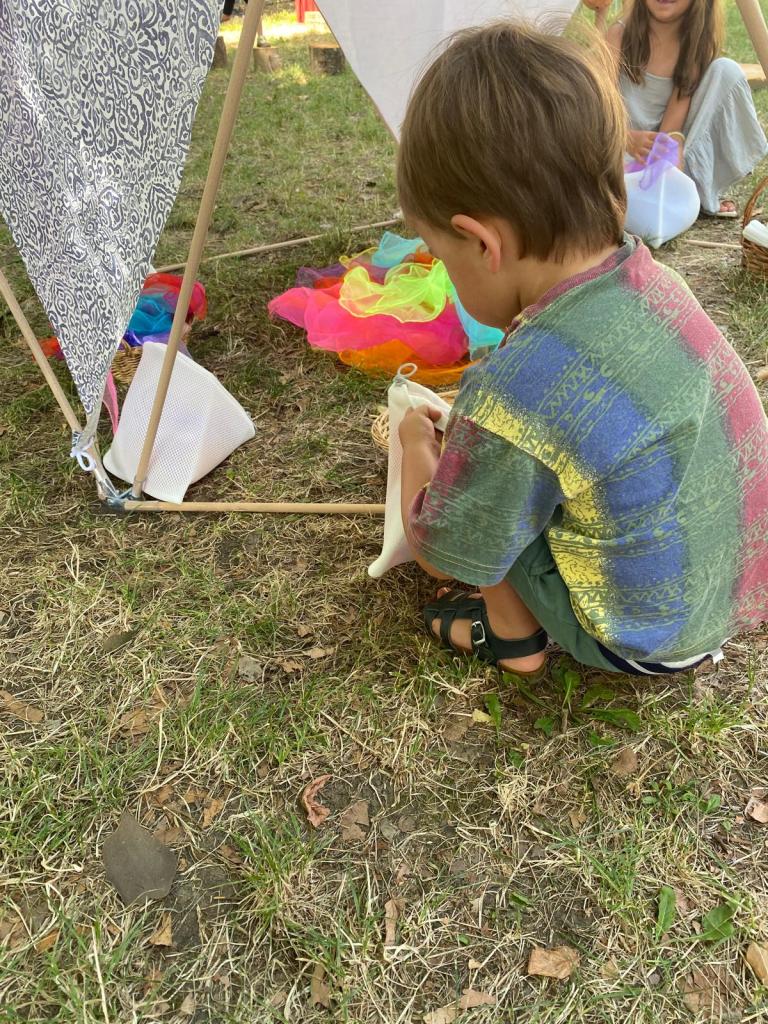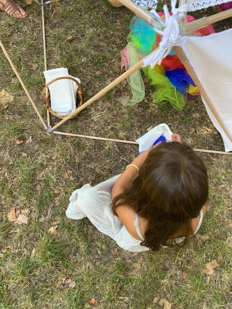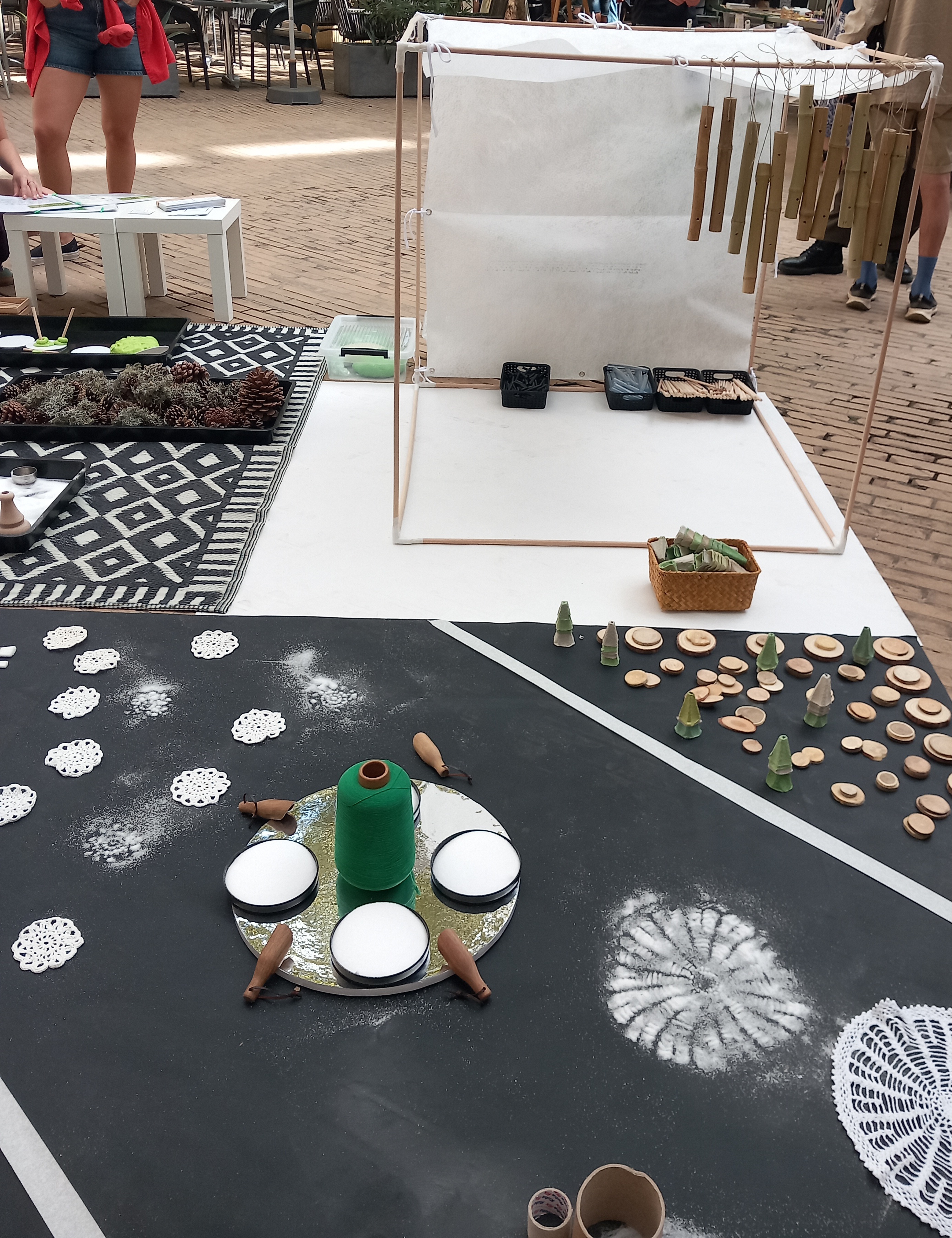 Nous vous proposons de vivre et d’habiter une forêt imaginaire et multi-sensorielle grâce à des matériaux naturels et de récupération, transformés et assemblés : collants de l’usine Well du Vigan, lavande, sable, blé etc. Les œuvres immersives d’Ernesto Neto nous ont fortement inspiré.