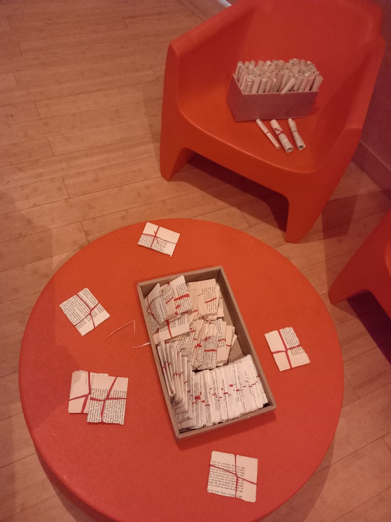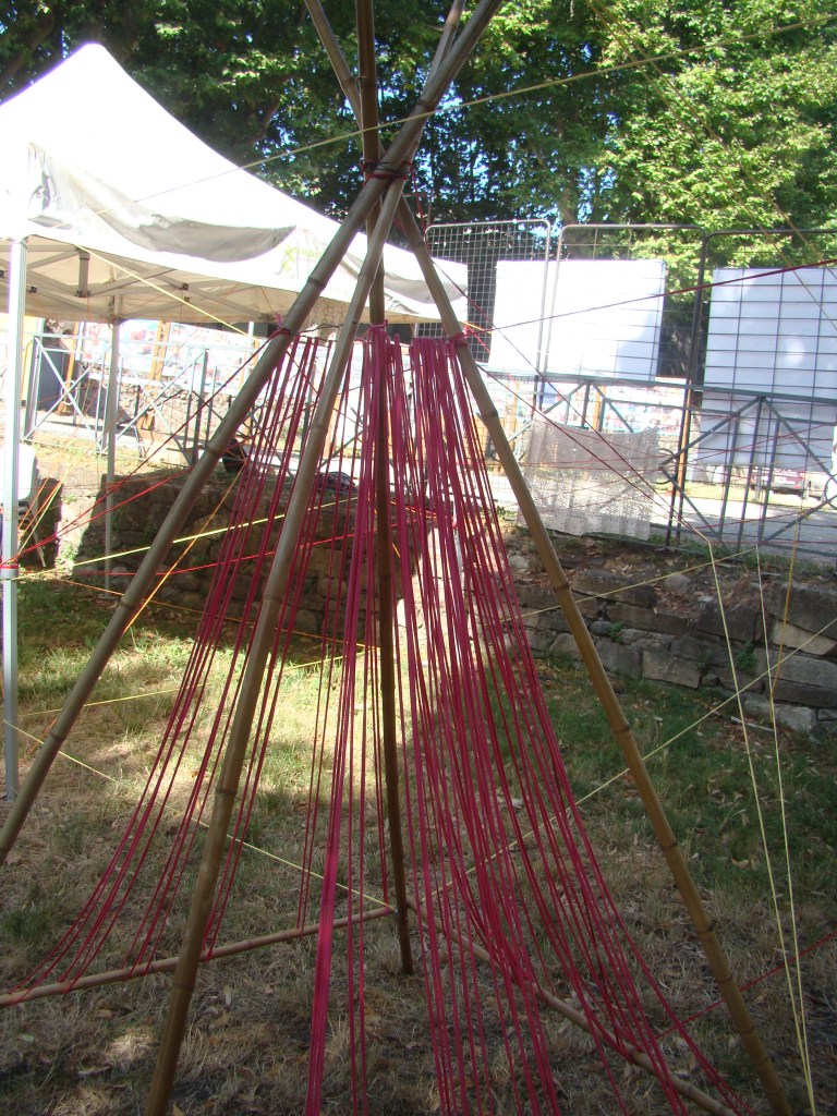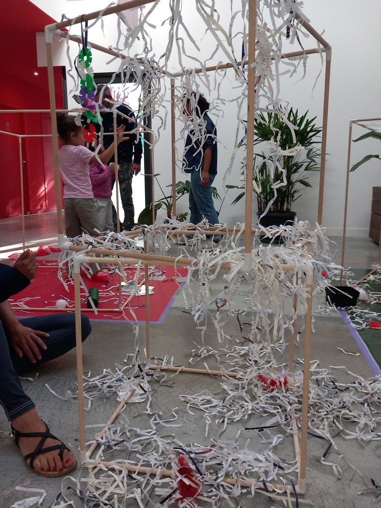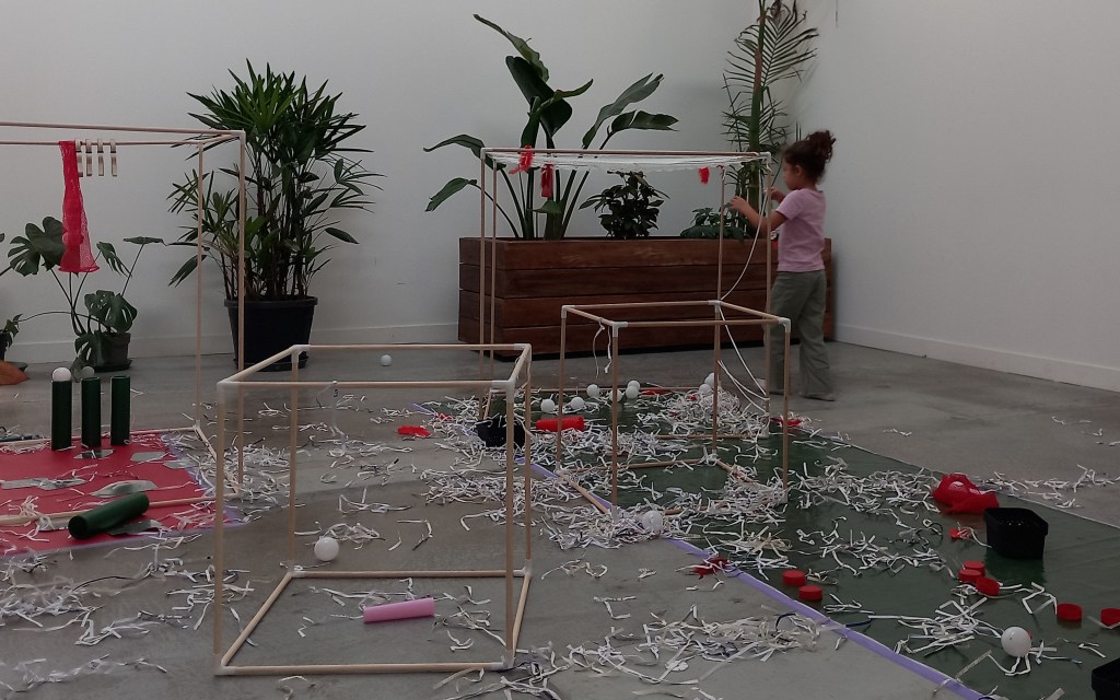 Les fils de trapilho relient les différents espaces du festival et nous relient nous aussi ici et aujourd’hui autour de la petite enfance. C’est une œuvre qui s’élabore grâce à la participation de toutes celles et ceux qui tirent des fils d’un endroit à l’autre. On peut même y accrocher des choses surprenantes ! Les lieux se redéfinissent grâce à l’action de ses occupant-e-s et modifie notre perception par le jeu et la coopération.
