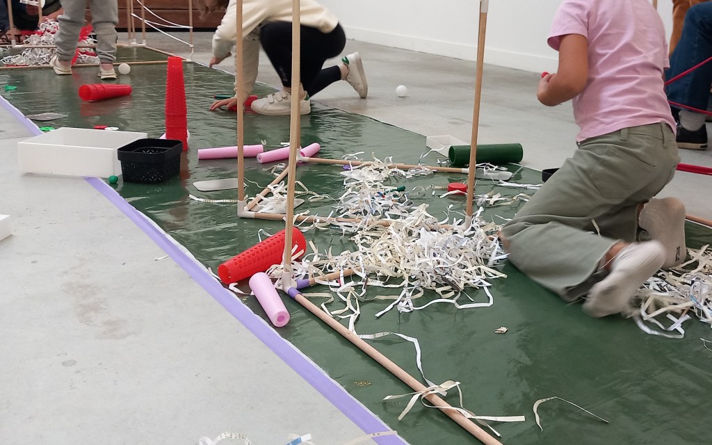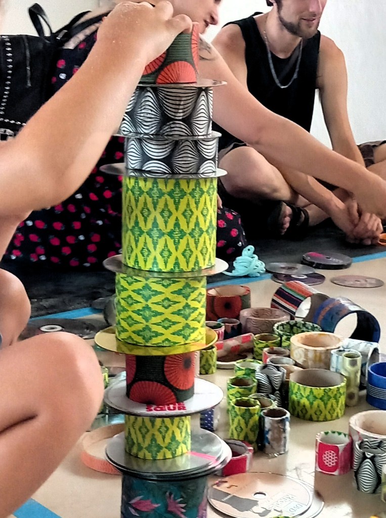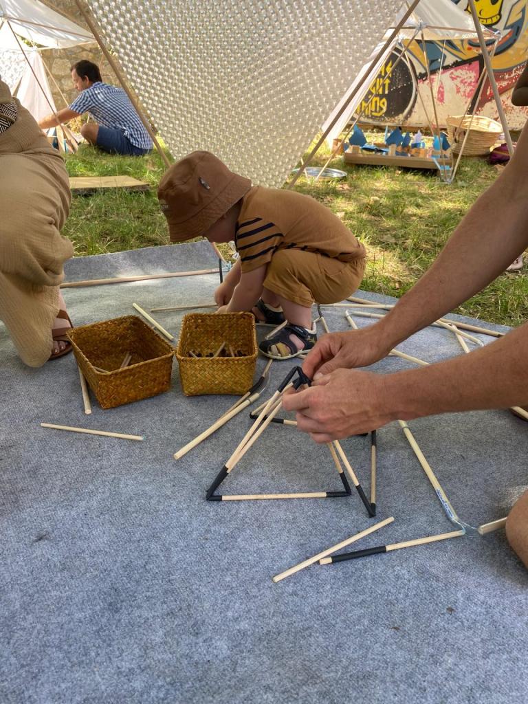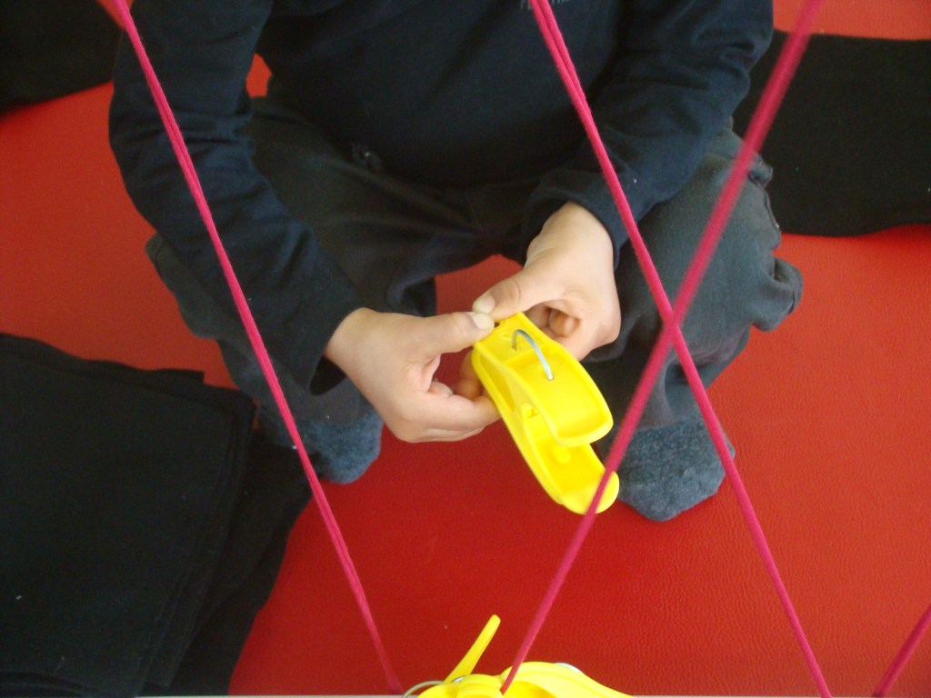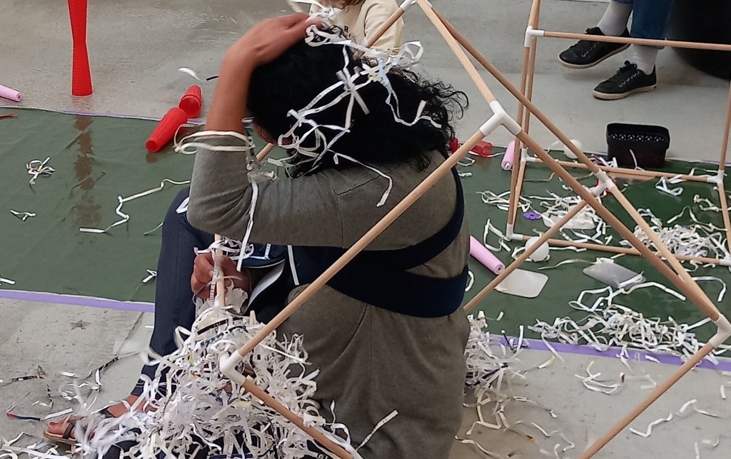 Les fils de trapilho relient les différents espaces du festival et nous relient nous aussi ici et aujourd’hui autour de la petite enfance. C’est une œuvre qui s’élabore grâce à la participation de toutes celles et ceux qui tirent des fils d’un endroit à l’autre. On peut même y accrocher des choses surprenantes ! Les lieux se redéfinissent grâce à l’action de ses occupant-e-s et modifie notre perception par le jeu et la coopération.